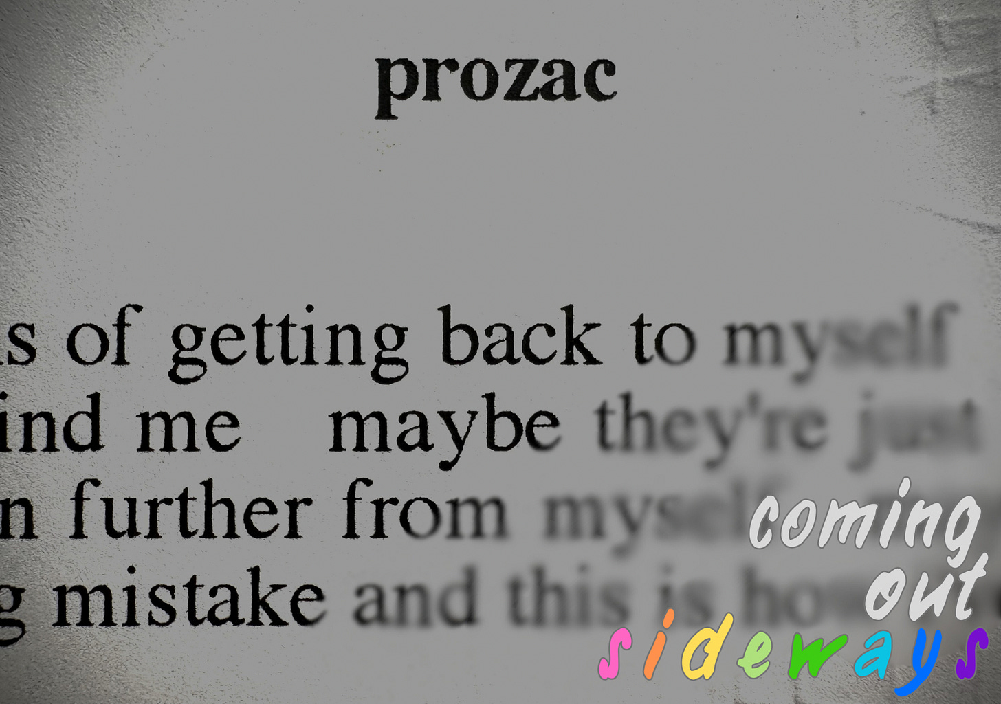 maybe these means of getting back to myself discovering what is me trying to find me maybe they're just pushing me away from myself even further from myself maybe there is no me really it's all a big mistake and this is how i've always been and how i'll always be maybe time is the answer time can't come in green and white pills in a little plastic bottle but no amount of time is short enough when you've been on your ass this long almost two years now but god it seems like a million and even after all the time i need has passed how will i know? how will i know where the drugs end and me begins? i'm sick i'm so fucking sick but i can't tell if it's really me feeling sick or if it's just the drugs i can't fucking tell anything anymore maybe these pills are all i am now because god knows i've been searching reaching inside myself trying to find that piece of me that has disappeared and nothing else can ever take its place